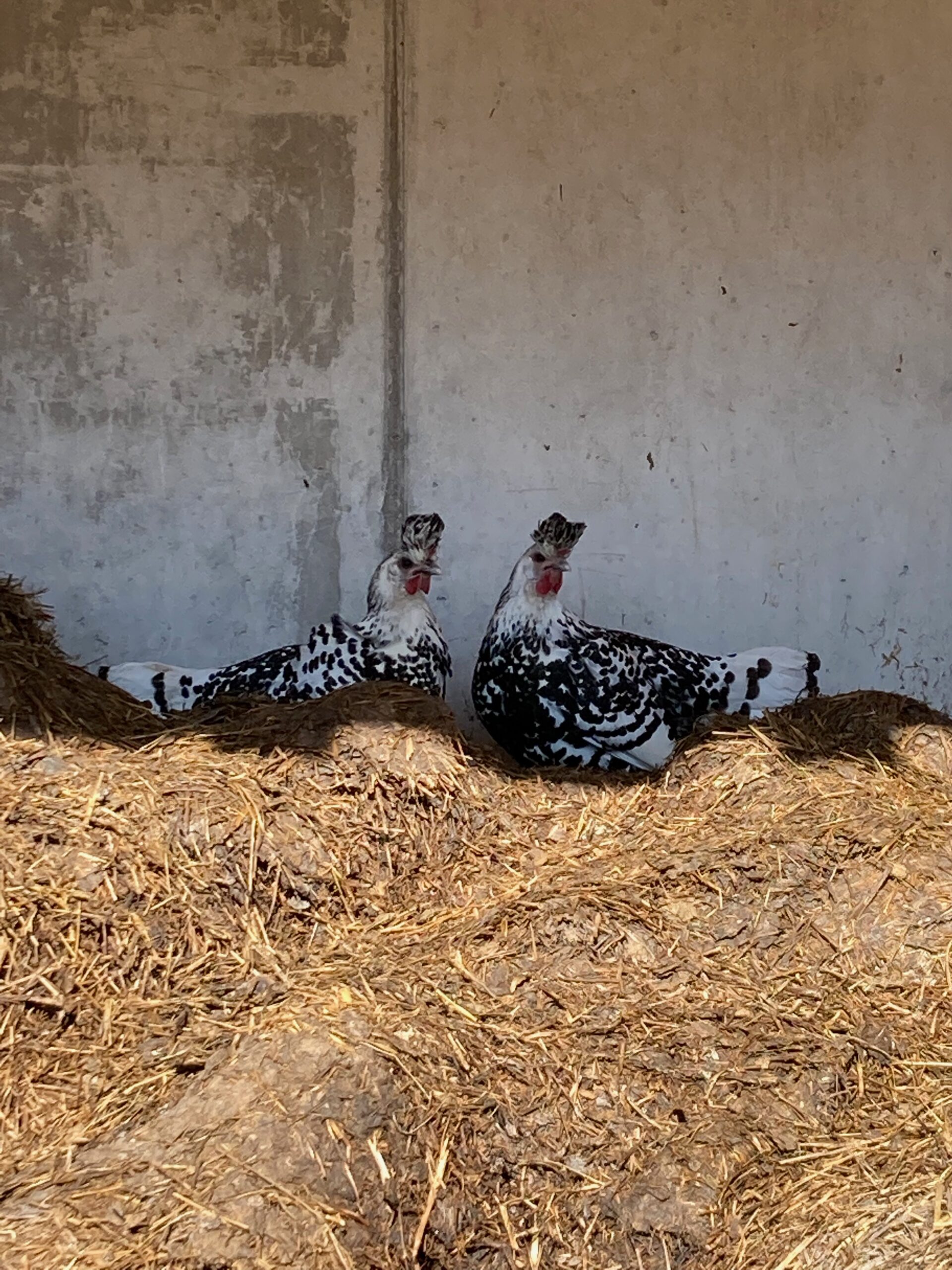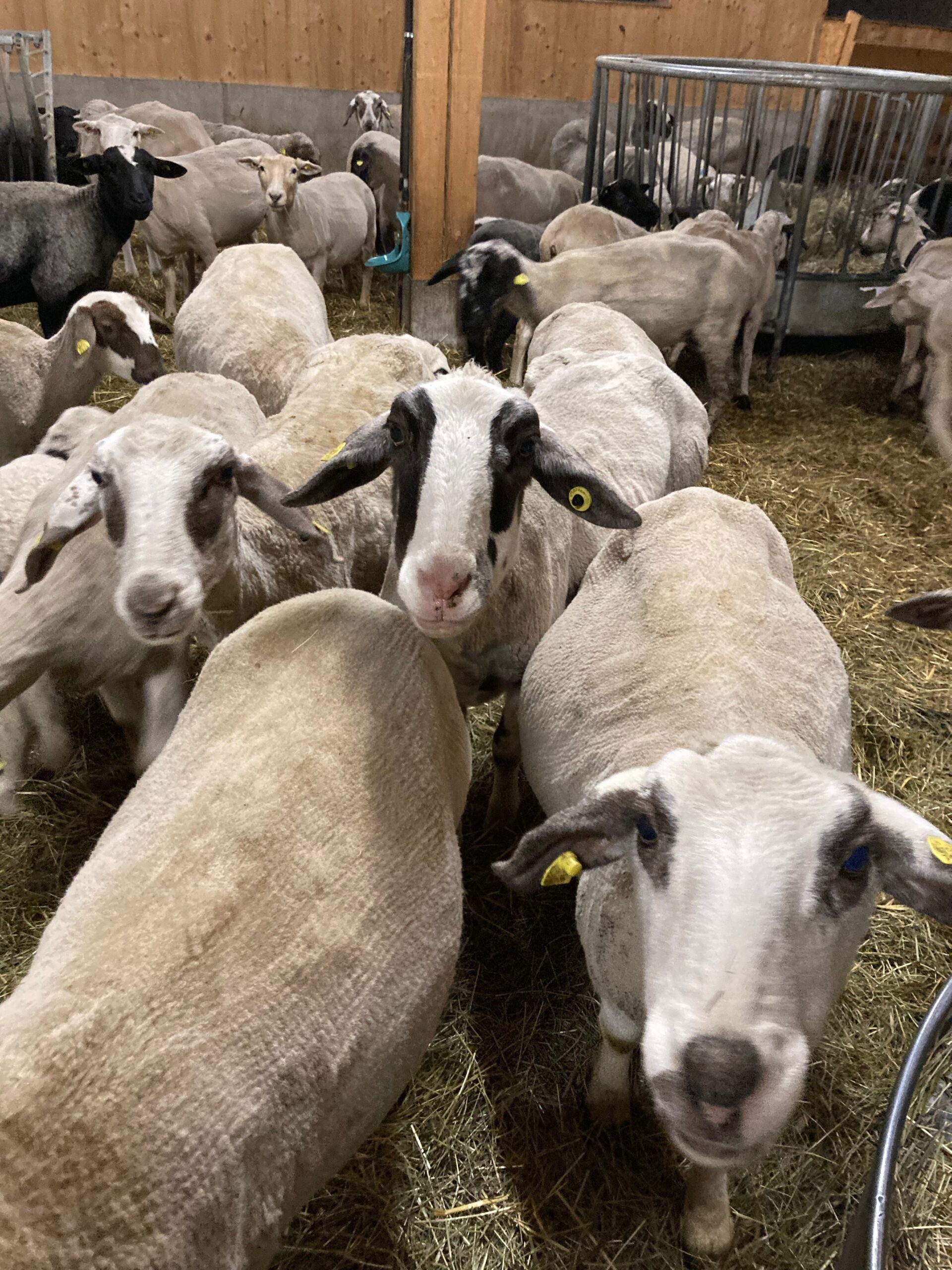 Die Herde Spiegelschafe verbringt den Frühling und Herbst auf unseren Weiden in Dorfnähe, den Sommer auf der Alp in Savognin und den Winter im Kaltstall auf dem Hof, wo sich auch unsere Appenzeller Spitzhaubenhühner befinden.